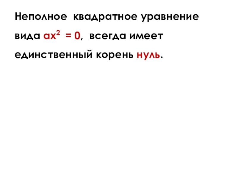 Слайд 22Неполное квадратное уравнение вида ax2 = 0, всегда имеет единственный корень