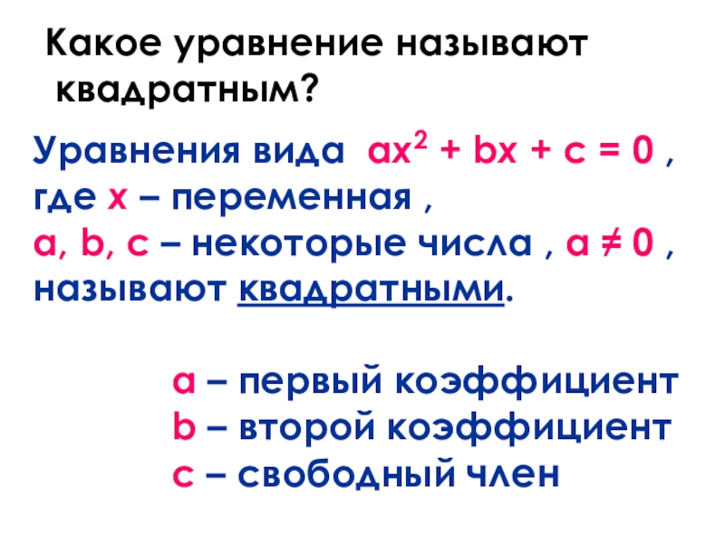 где x – переменная , a, b, c – некоторые числа , а ≠ 0 , называют квадратными.