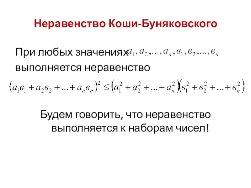 Неравенство Коши-БуняковскогоПри любых значенияхвыполняется неравенство Будем говорить, что неравенство выполняется к наборам чисел!