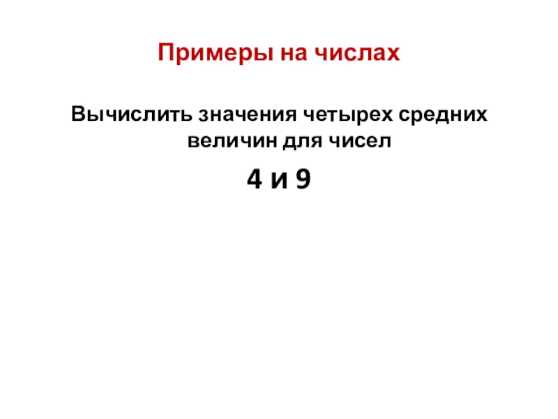 Примеры на числахВычислить значения четырех средних величин для чисел 4 и 9