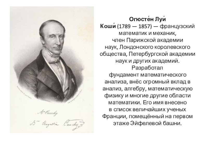 Слайд 2Огюсте́н Луи́ Коши́ (1789 — 1857) — французский математик и механик, член Парижской академии наук, Лондонского королевского общества, Петербургской академии наук и