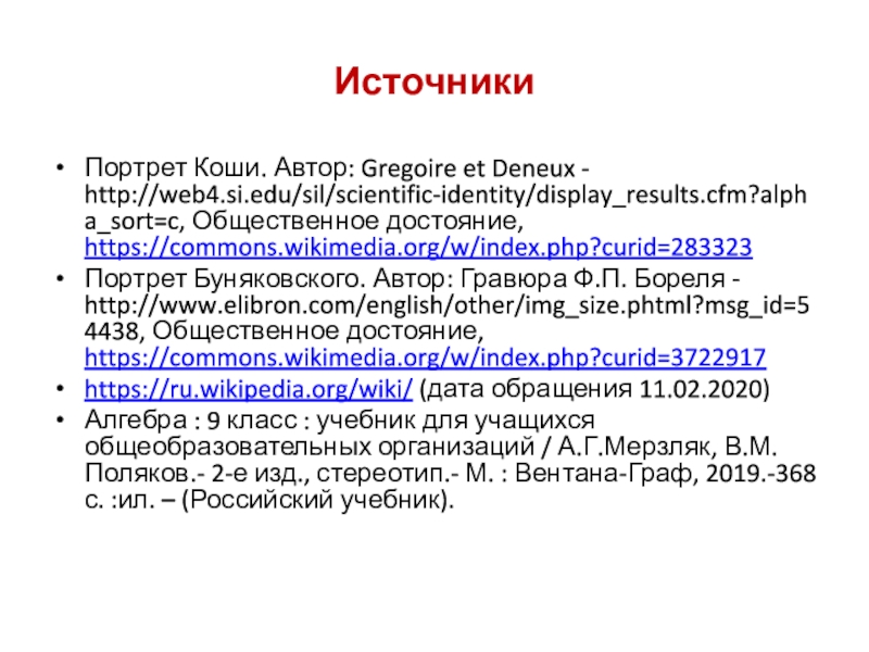 Источники Портрет Коши. Автор: Gregoire et Deneux - http://web4.si.edu/sil/scientific-identity/display_results.cfm?alpha_sort=c, Общественное достояние, https://commons.wikimedia.org/w/index.php?curid=283323Портрет Буняковского. Автор: Гравюра Ф.П. Бореля