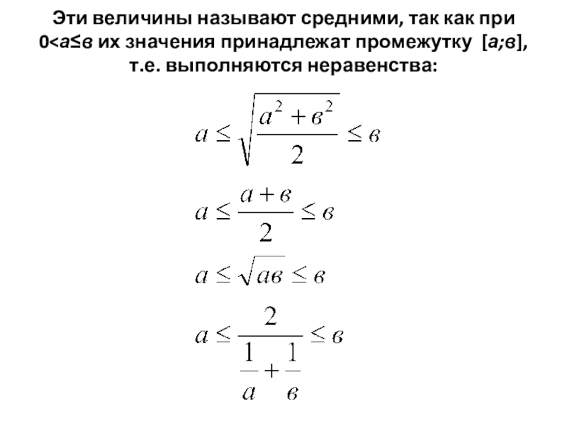Среднее арифметическое чисел а и вСреднее геометрическое чисел а и вСреднее квадратичное чисел а и вСреднее гармоническое