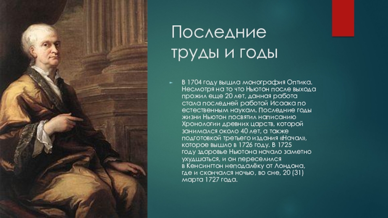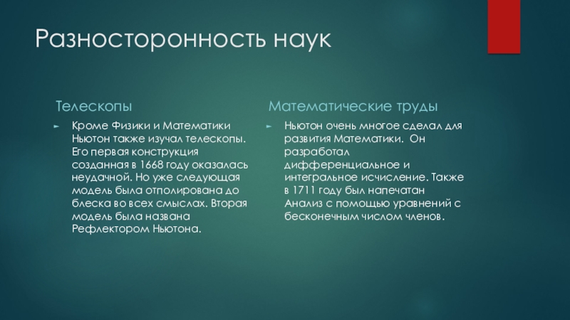 Ньютон очень многое сделал для развития Математики. Он разработал дифференциальное и интегральное исчисление. Также в 1711 году был напечатан Анализ с помощью уравнений с бесконечным числом членов.