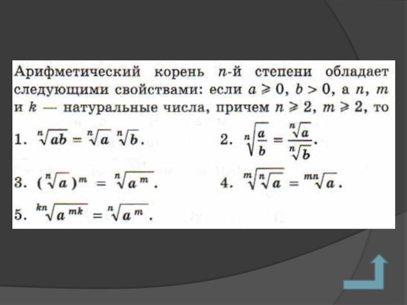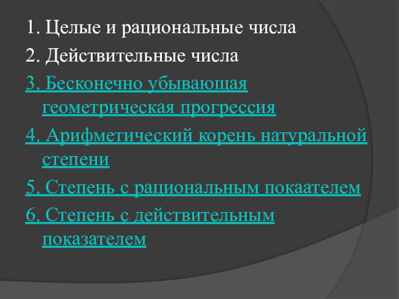 1. Целые и рациональные числа2. Действительные числа3. Бесконечно убывающая геометрическая прогрессия4. Арифметический корень натуральной степени5. Степень с