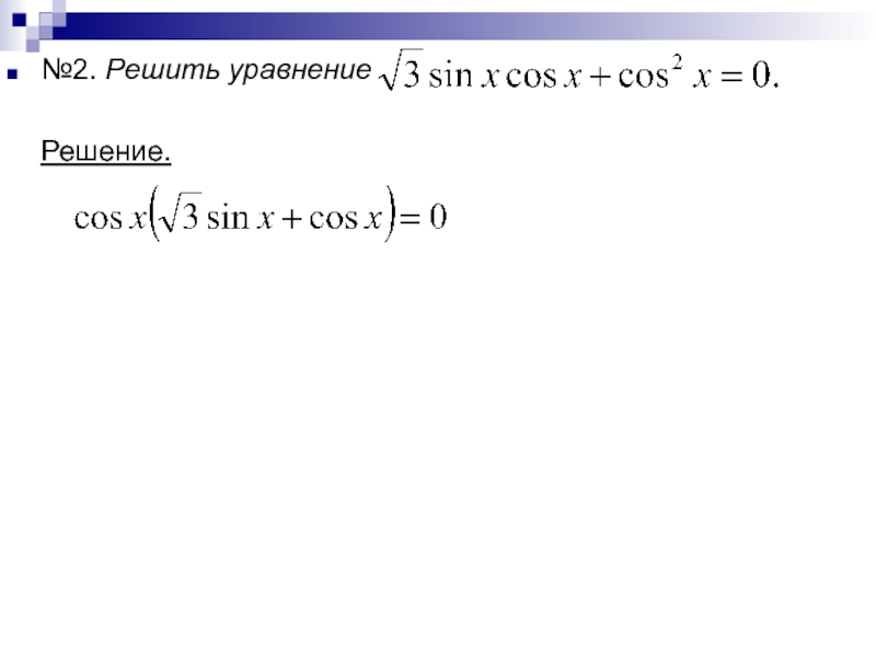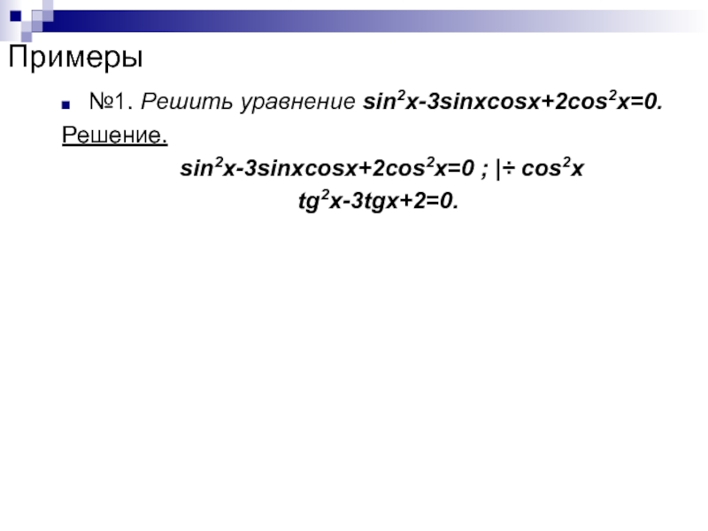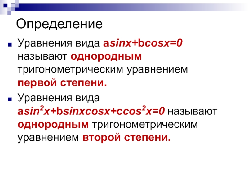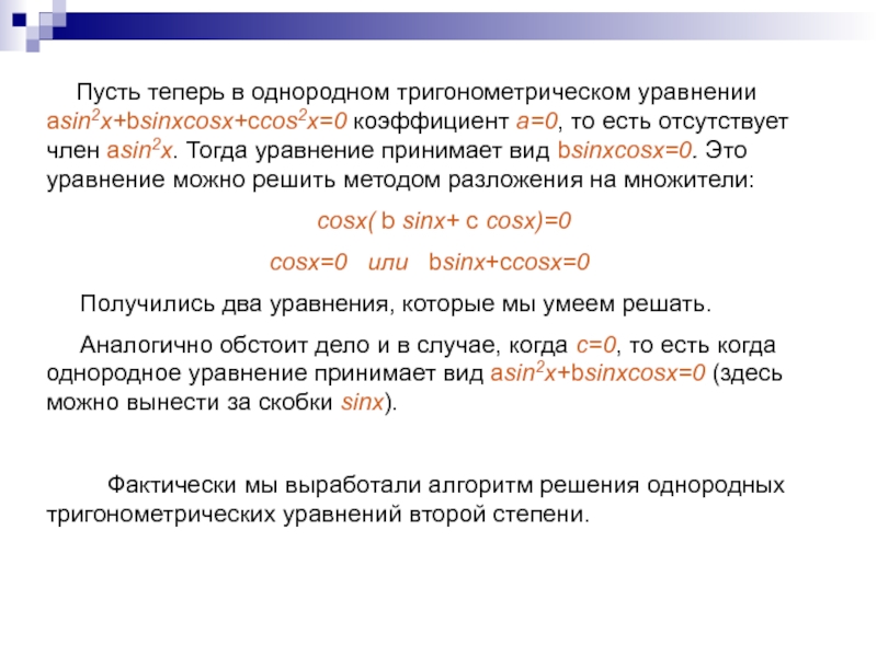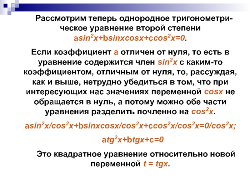 Рассмотрим теперь однородное тригонометри-ческое уравнение второй степени asin2x+bsinxcosx+ccos2x=0.