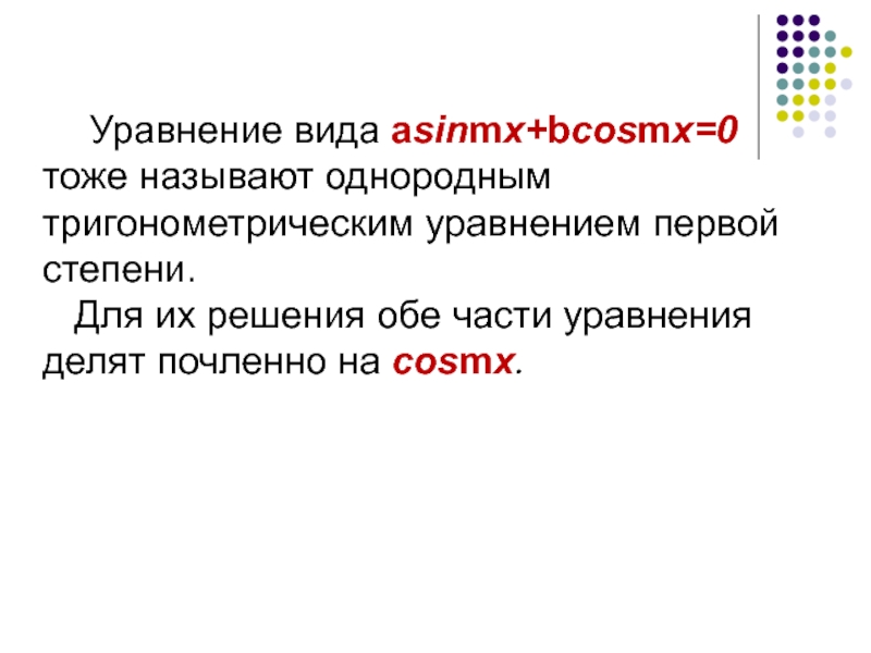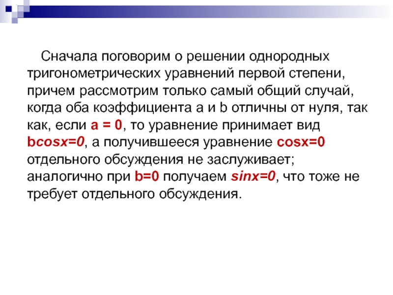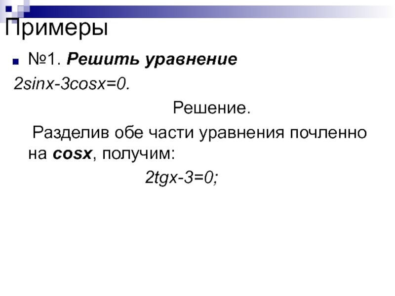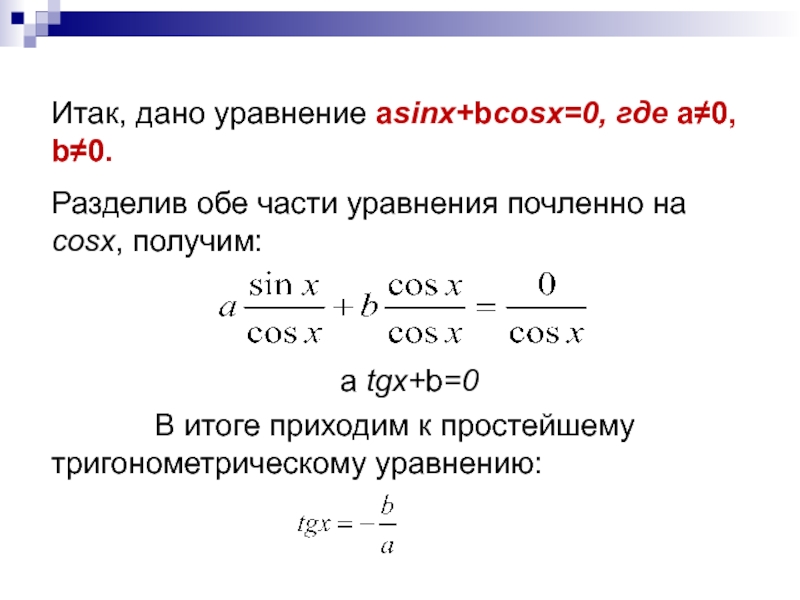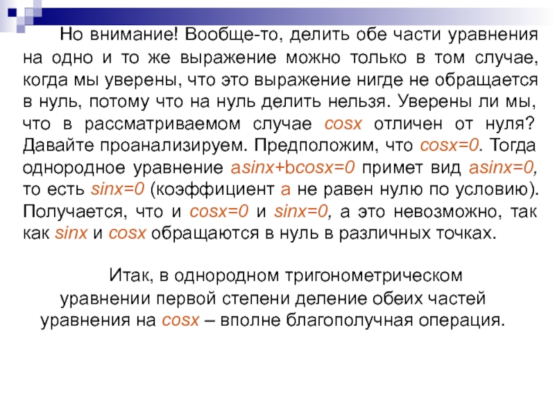 Итак, в однородном тригонометрическом уравнении первой степени деление обеих частей уравнения на cosx – вполне благополучная операция.