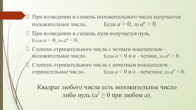 Квадрат любого числа есть положительное число либо нуль (а2 ≥ 0 при любом а).