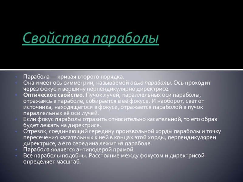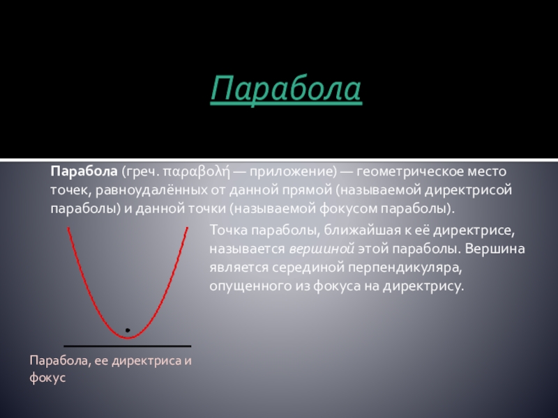 Точка параболы, ближайшая к её директрисе, называется вершиной этой параболы. Вершина является серединой перпендикуляра, опущенного из фокуса на директрису.