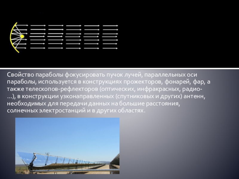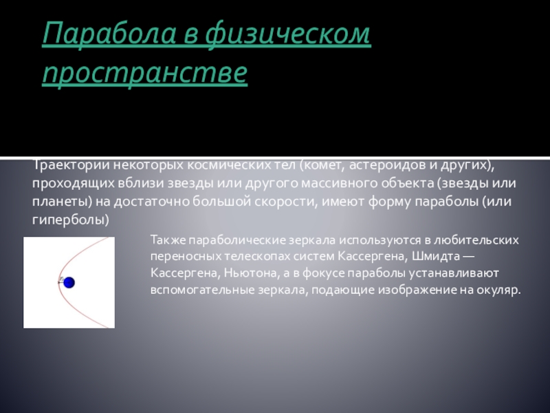 Также параболические зеркала используются в любительских переносных телескопах систем Кассергена, Шмидта — Кассергена, Ньютона, а в фокусе параболы устанавливают вспомогательные зеркала, подающие изображение на окуляр.