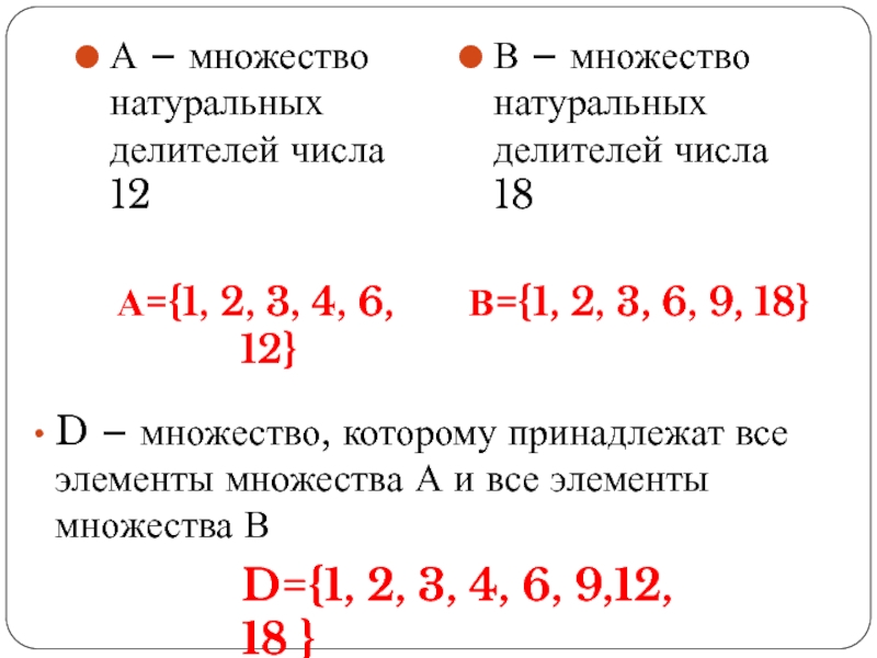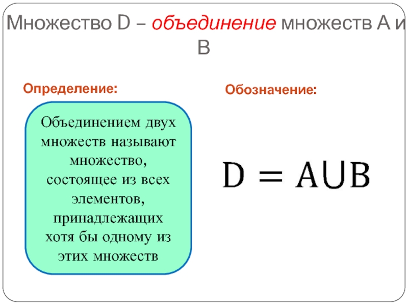 D – множество, которому принадлежат все элементы множества А и все элементы множества В