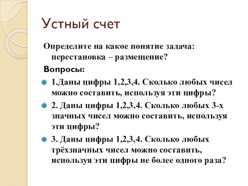 2. Даны цифры 1,2,3,4. Сколько любых 3-х значных чисел можно составить, используя эти цифры?