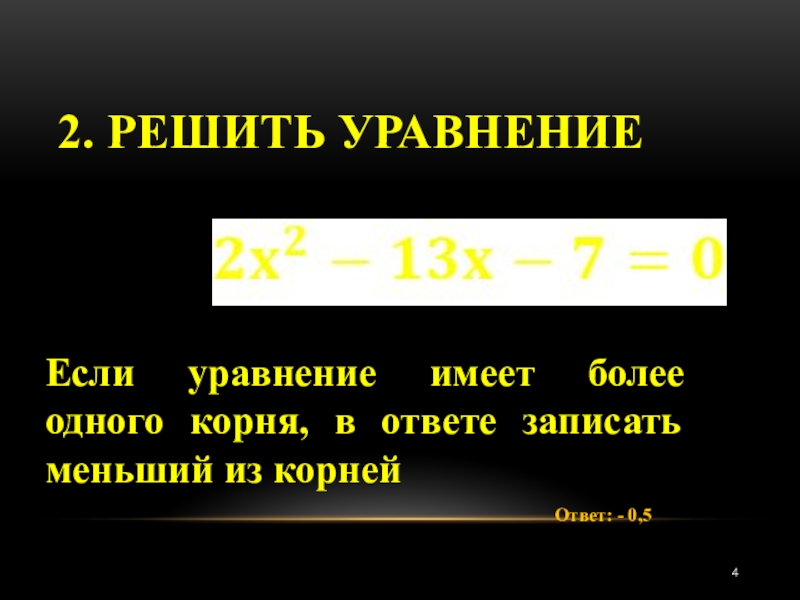 2. Решить уравнениеОтвет: - 0,5Если уравнение имеет более одного корня, в ответе записать меньший из корней