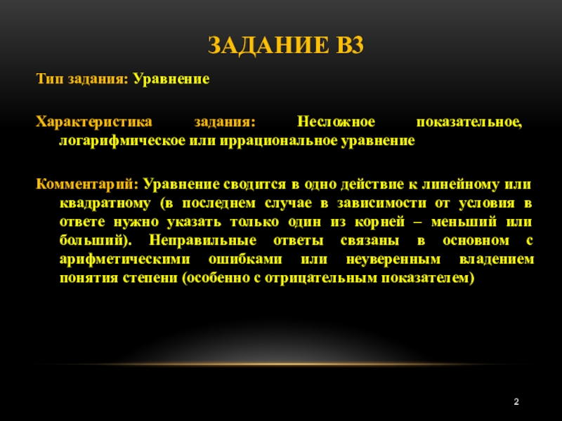 Задание В3Тип задания: УравнениеХарактеристика задания: Несложное показательное, логарифмическое или иррациональное уравнениеКомментарий: Уравнение сводится в одно действие к линейному или квадратному (в последнем случае в зависимости от условия в ответе нужно указать только один из корней –