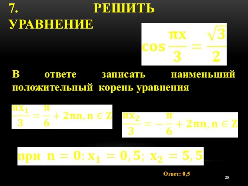 7. Решить уравнение Ответ: 0,5В ответе записать наименьший положительный корень уравнения