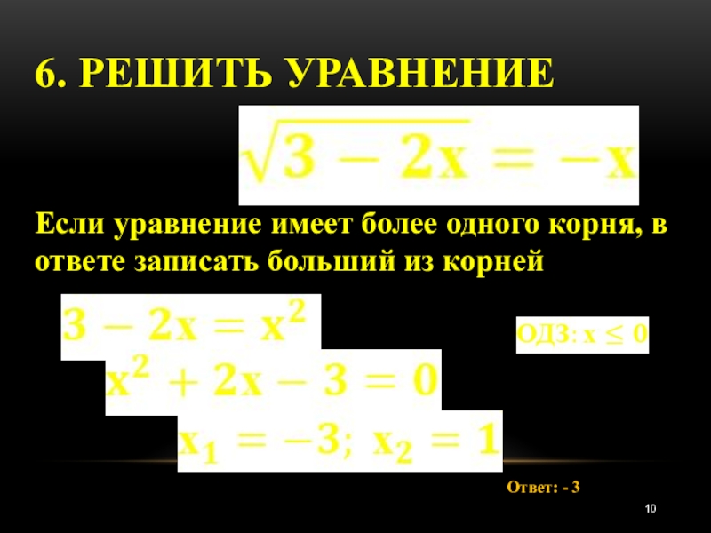 6. Решить уравнение Ответ: - 3Если уравнение имеет более одного корня, в ответе записать больший из корней