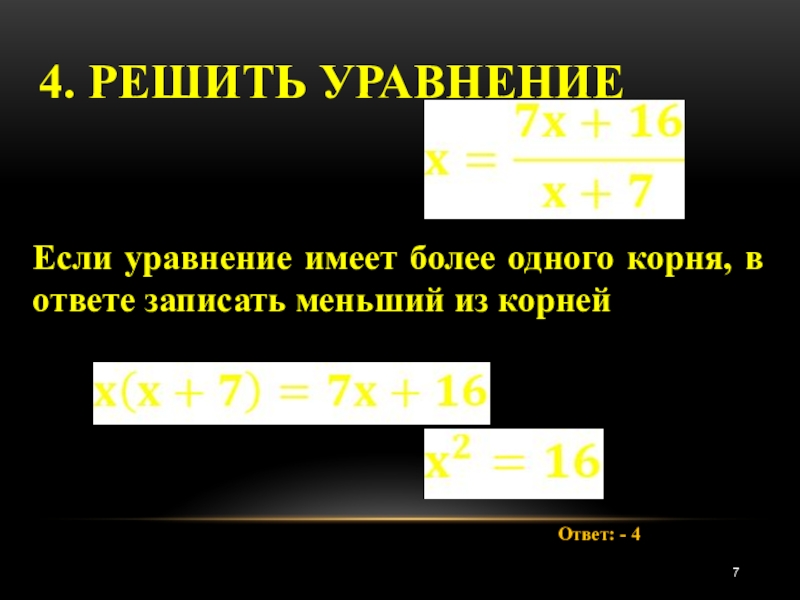 4. Решить уравнение Ответ: - 4Если уравнение имеет более одного корня, в ответе записать меньший из корней