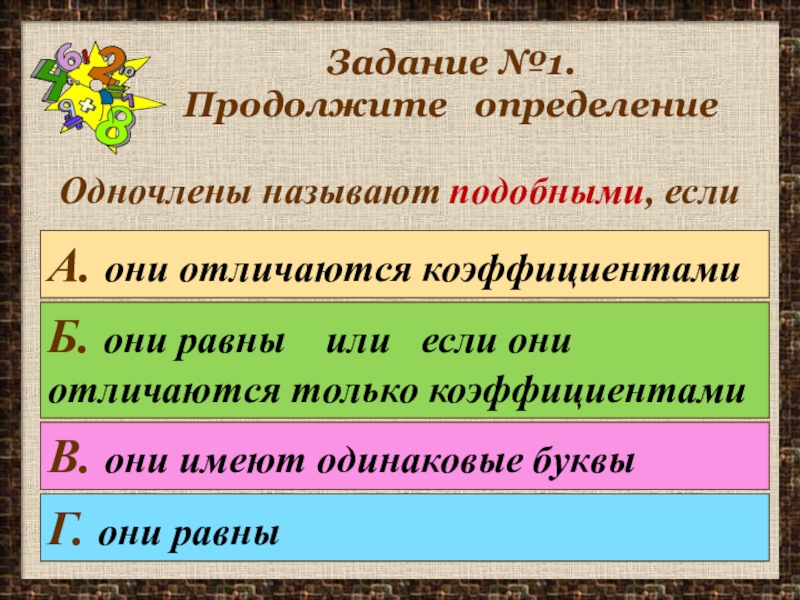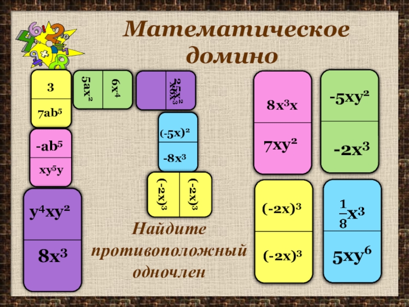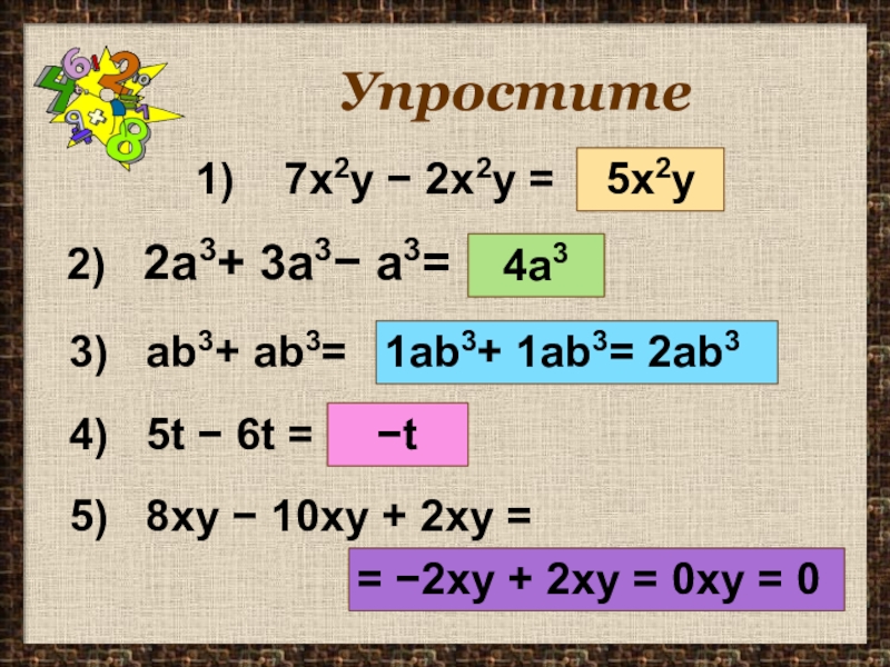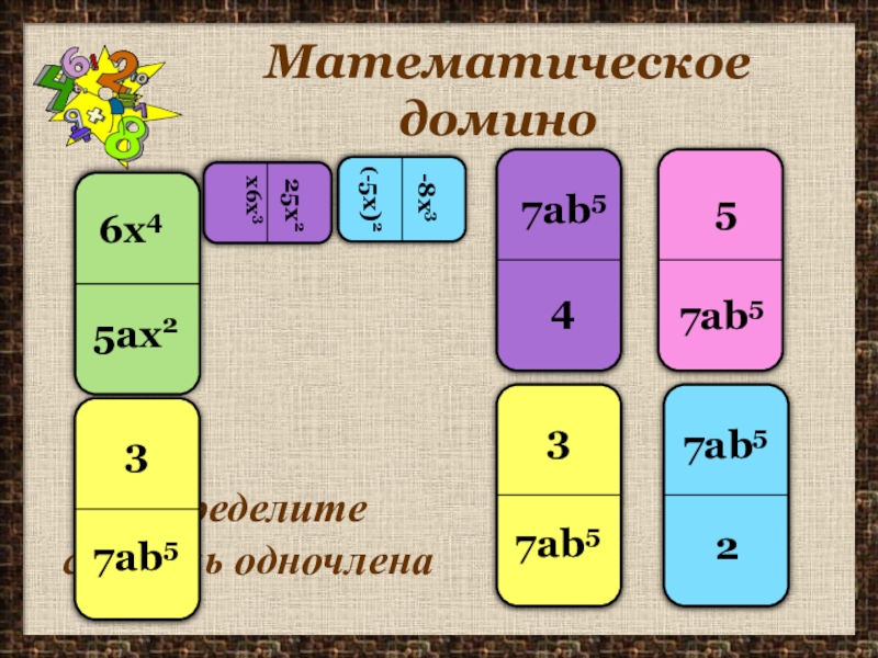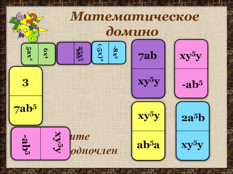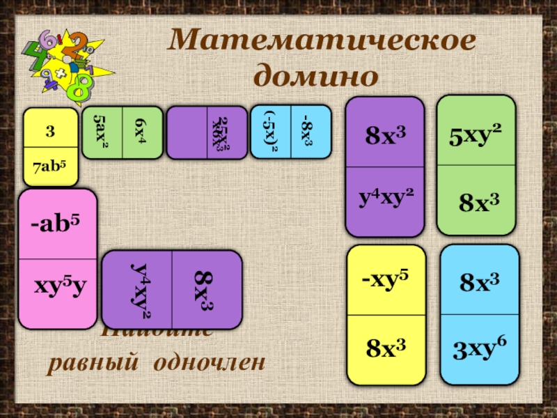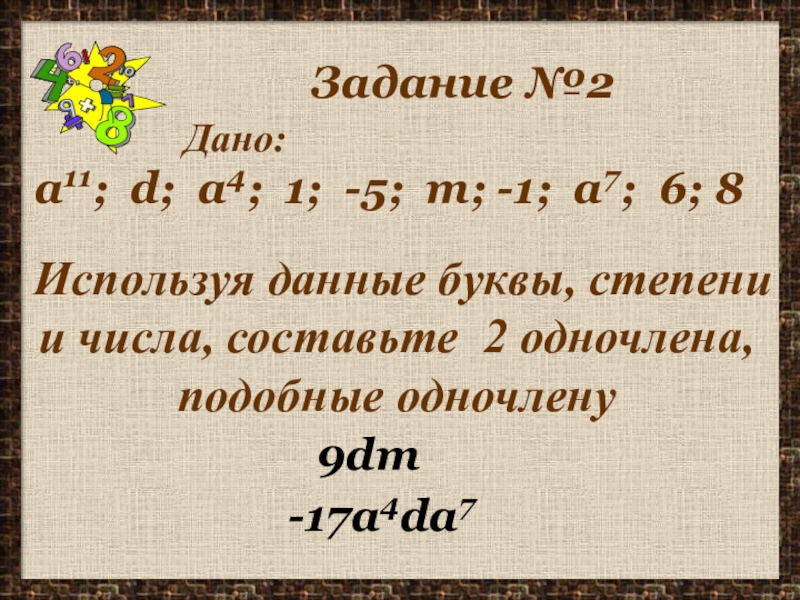 Используя данные буквы, степени и числа, составьте 2 одночлена, подобные одночлену