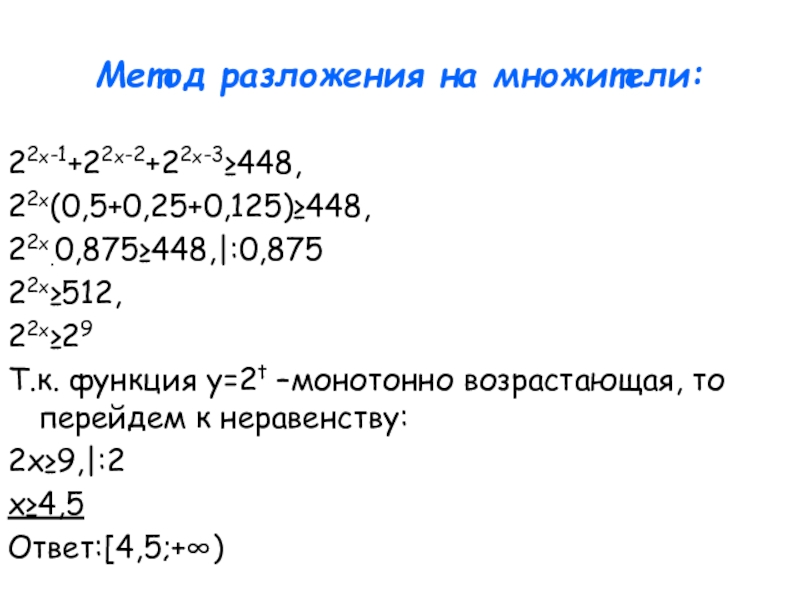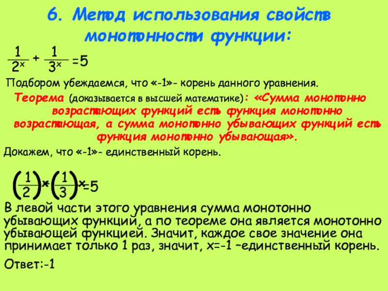 В левой части этого уравнения сумма монотонно убывающих функций, а по теореме она является монотонно убывающей функцией. Значит, каждое свое значение она принимает только 1 раз, значит, х=-1 –единственный корень.
