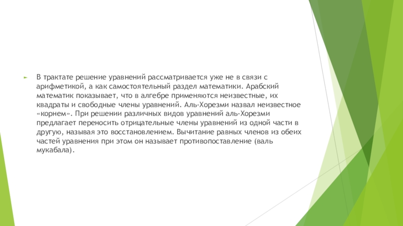 Слайд 9В трактате решение уравнений рассматривается уже не в связи с арифметикой,