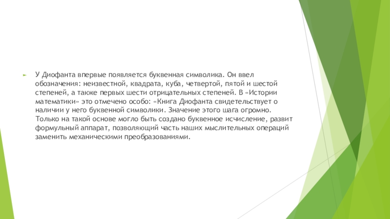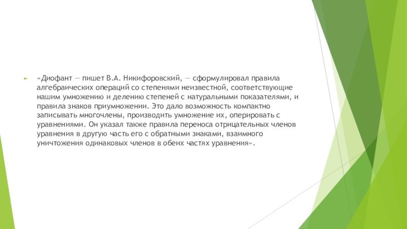 Слайд 5«Диофант — пишет В.А. Никифоровский, — сформулировал правила алгебраических операций со