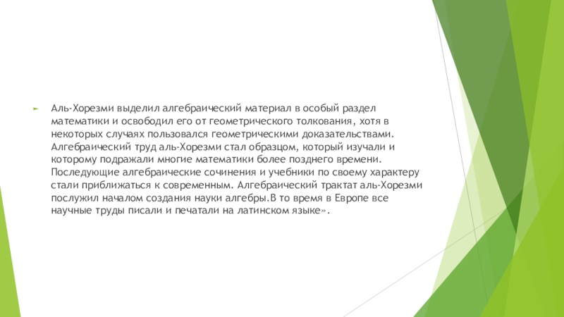 Слайд 10Аль-Хорезми выделил алгебраический материал в особый раздел математики и освободил его