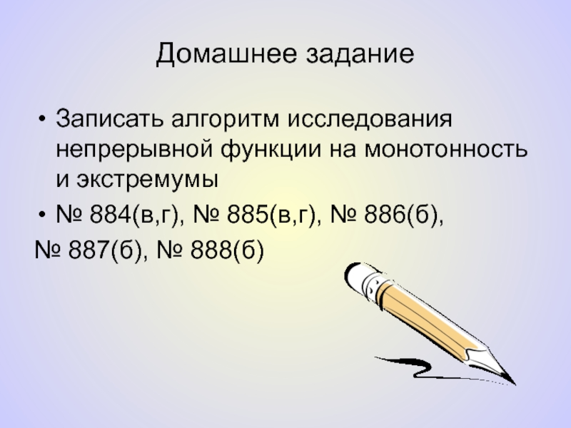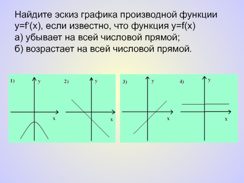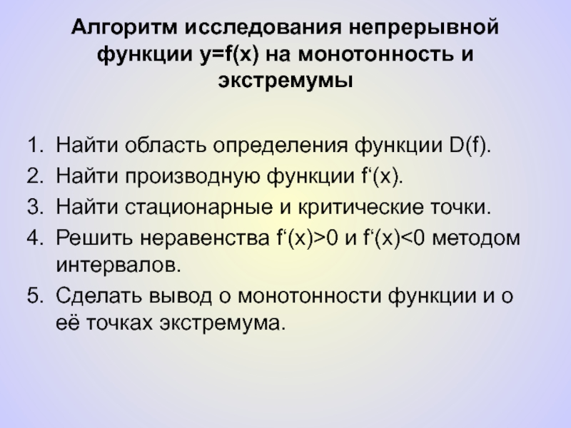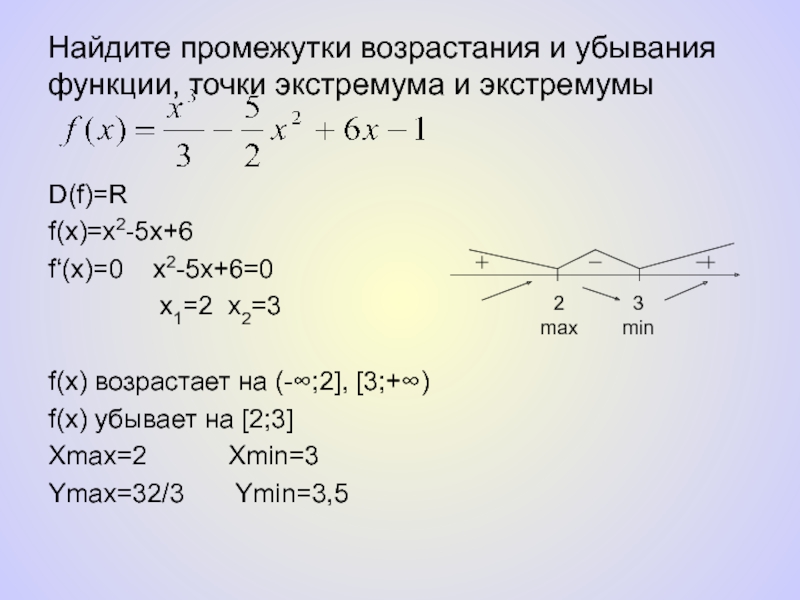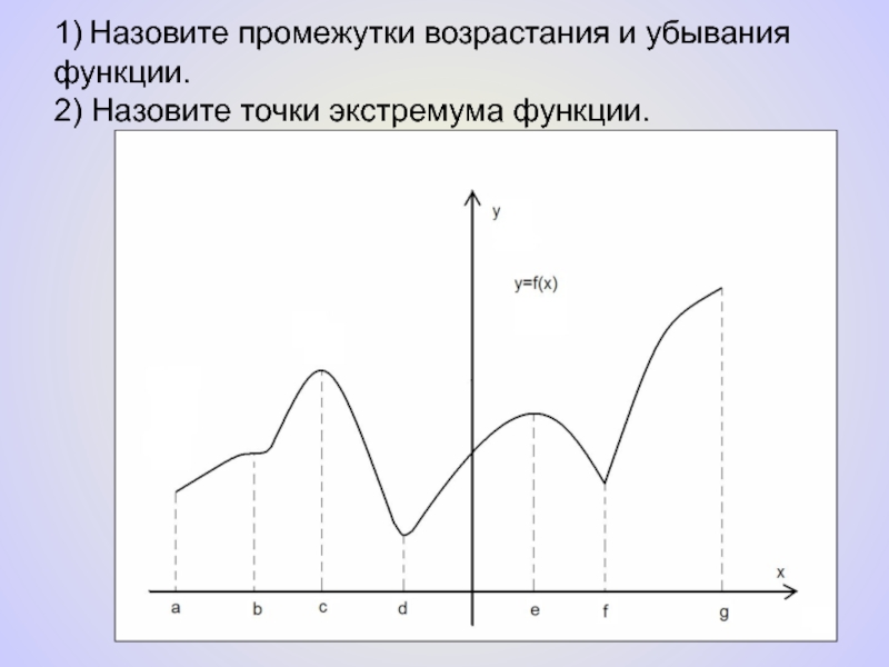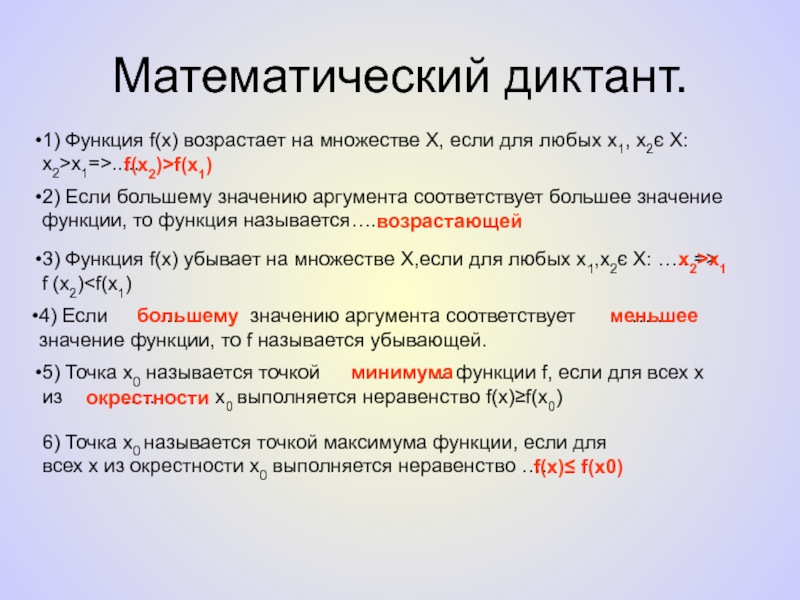 3) Функция f(x) убывает на множестве X,если для любых x1,x2є X: ….. => f (x2) 4) Если ….. значению аргумента соответствует ….. значение функции, то f называется убывающей. 5) Точка x0 называется точкой ….. функции f, если для всех x из ….. x0 выполняется неравенство f(x)≥f(x0) 6) Точка x0 называется точкой максимума функции, если для всех x из окрестности x0 выполняется неравенство ….. f(x2)>f(x1) возрастающей x2>x1 большему меньшее минимума окрестности f(x)≤ f(x0)