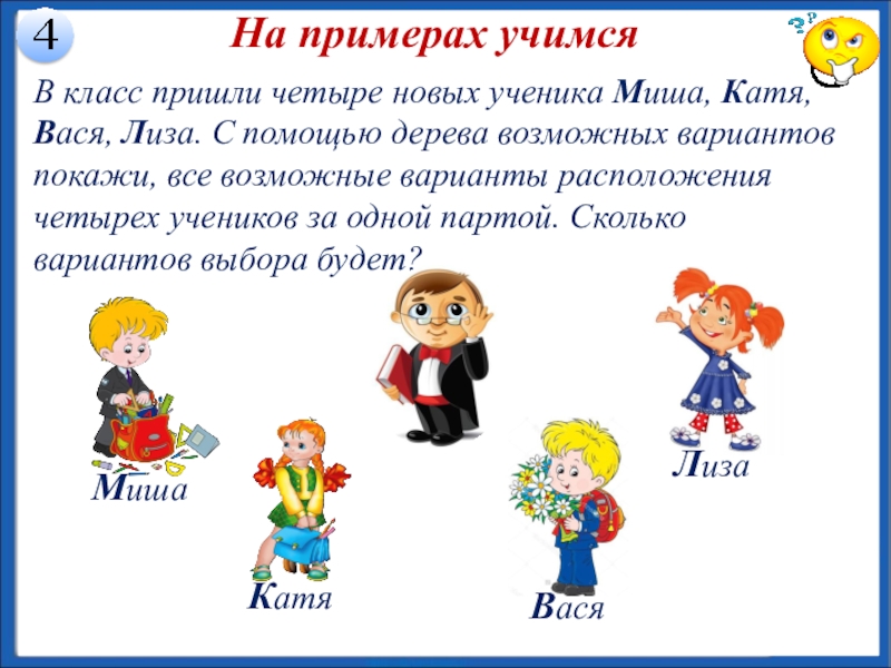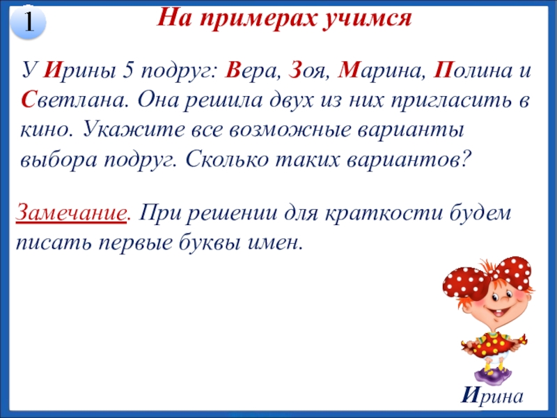 Замечание. При решении для краткости будем писать первые буквы имен.