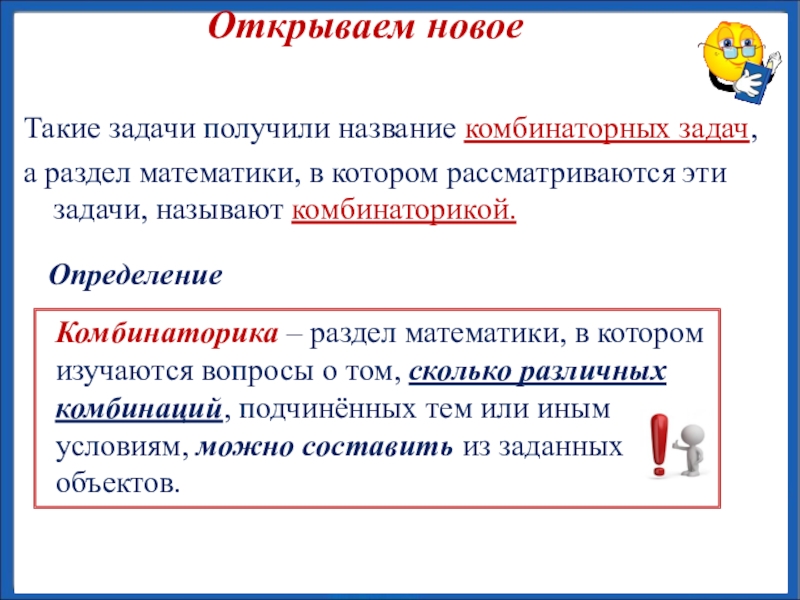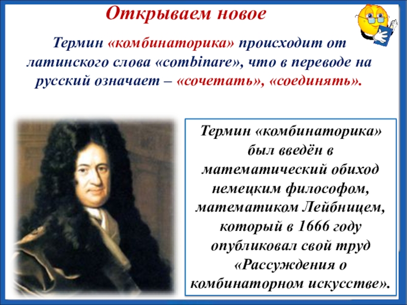 Термин «комбинаторика» происходит от латинского слова «combinare», что в переводе на русский означает – «сочетать», «соединять».
