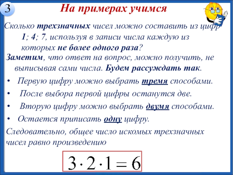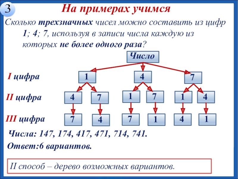 Сколько трехзначных чисел можно составить из цифр 1; 4; 7, используя в записи числа каждую из которых не более одного раза?
