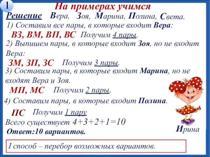 3) Составим пары, в которые входит Марина, но не входят Вера и Зоя.