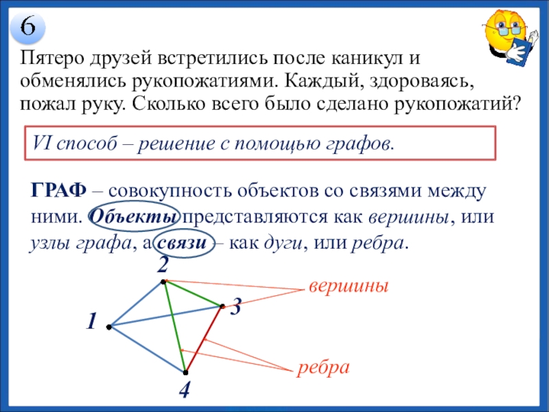 ГРАФ – совокупность объектов со связями между ними. Объекты представляются как вершины, или узлы графа, а связи – как дуги, или ребра.
