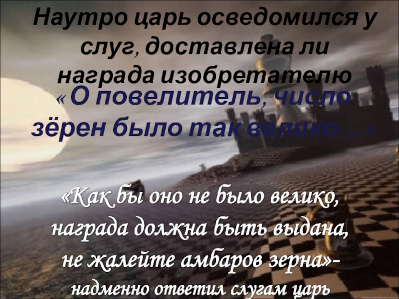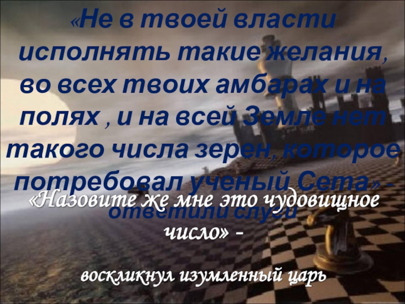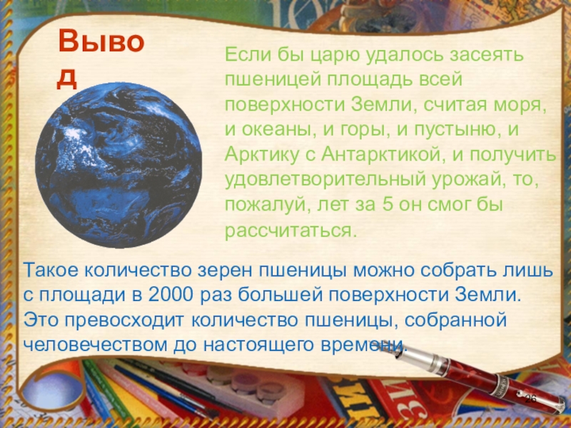 Такое количество зерен пшеницы можно собрать лишь с площади в 2000 раз большей поверхности Земли. Это превосходит количество пшеницы, собранной человечеством до настоящего времени.