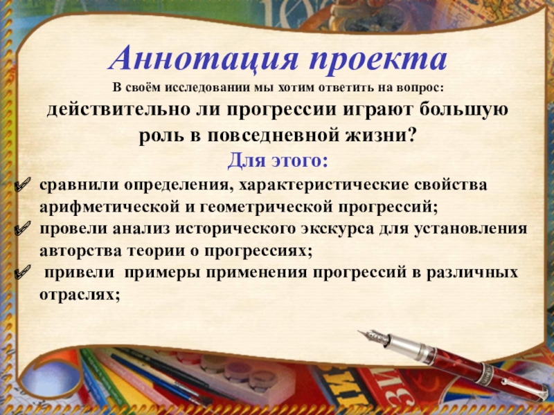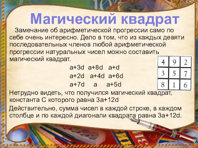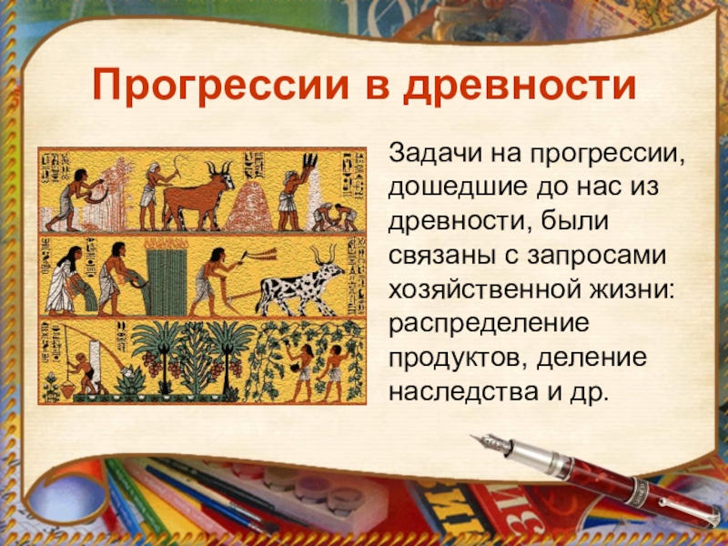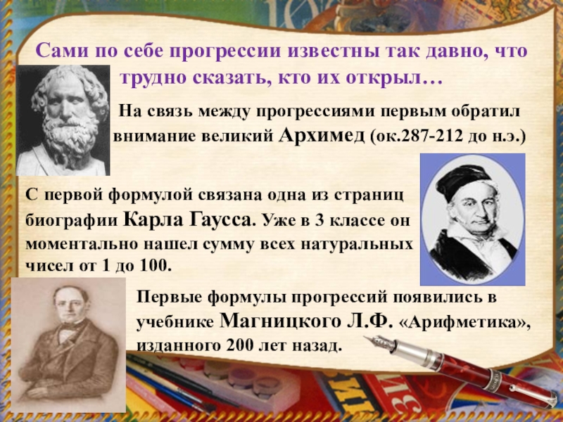 Первые формулы прогрессий появились в учебнике Магницкого Л.Ф. «Арифметика», изданного 200 лет назад.