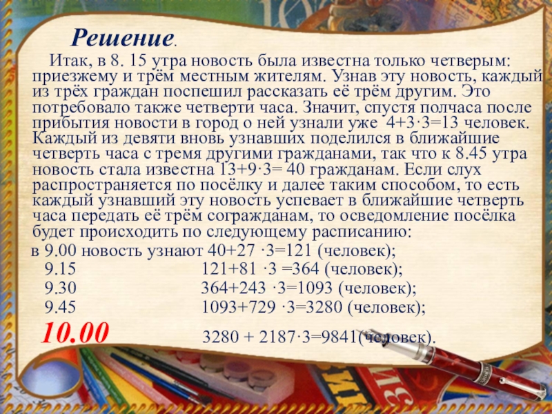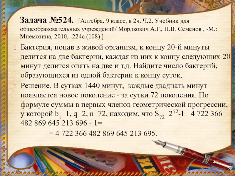 Решение. В сутках 1440 минут, каждые двадцать минут появляется новое поколение - за сутки 72 поколения. По формуле суммы n первых членов геометрической прогрессии, у которой b1=1, q=2, n=72, находим, что S72=272-1= 4 722 366 482 869 645 213 696 - 1=