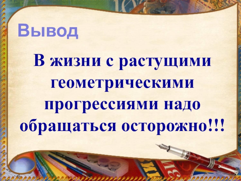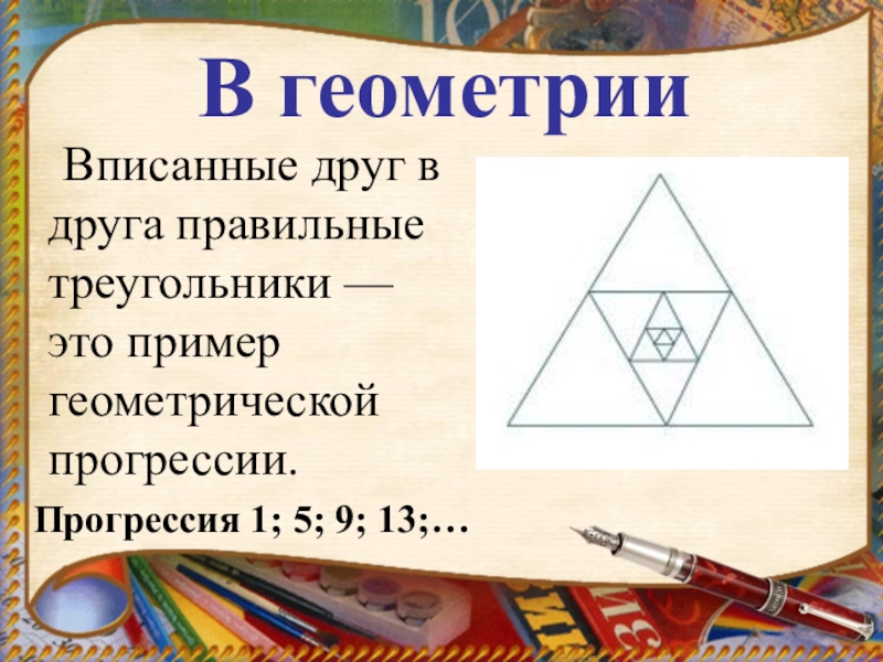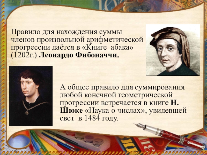 А общее правило для суммирования любой конечной геометрической прогрессии встречается в книге Н. Шюке «Наука о числах», увидевшей свет в 1484 году.
