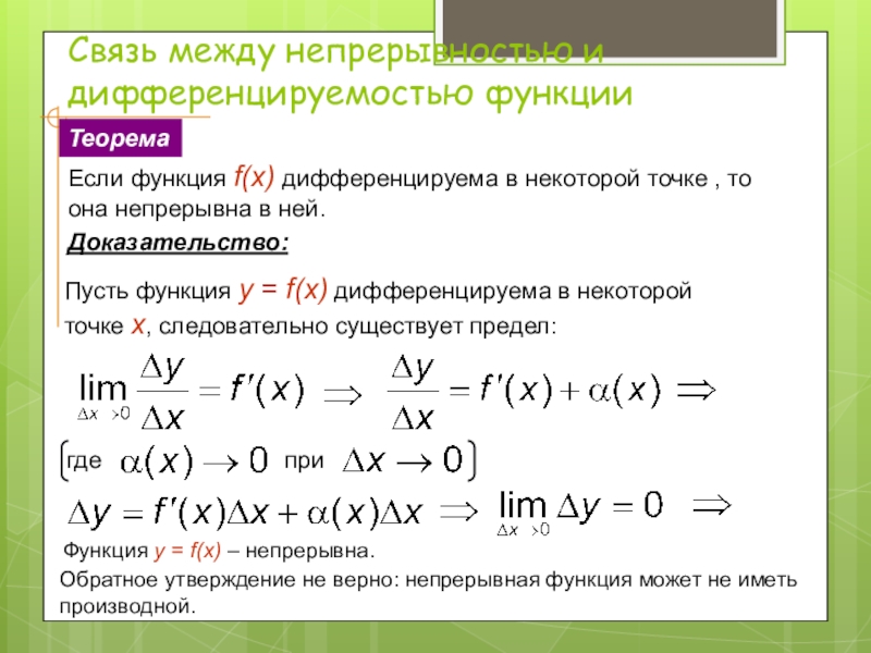Пусть функция y = f(x) дифференцируема в некоторой точке х, следовательно существует предел: