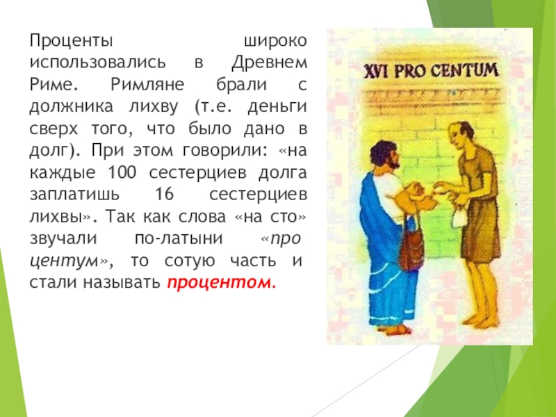 Слайд 5Проценты широко использовались в Древнем Риме. Римляне брали с должника лихву
