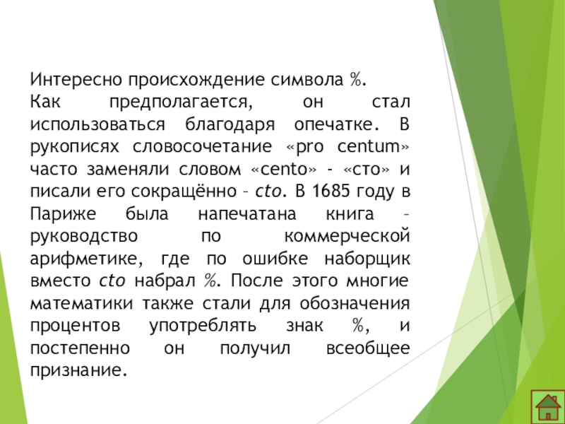 В рукописях словосочетание «pro centum» часто заменяли словом «cento» - «сто» и писали его сокращённо – cto. В 1685 году в Париже была напечатана книга – руководство по коммерческой арифметике, где по ошибке наборщик вместо cto набрал %. После этого многие математики также стали для обозначения процентов употреблять знак %, и постепенно он получил всеобщее признание.