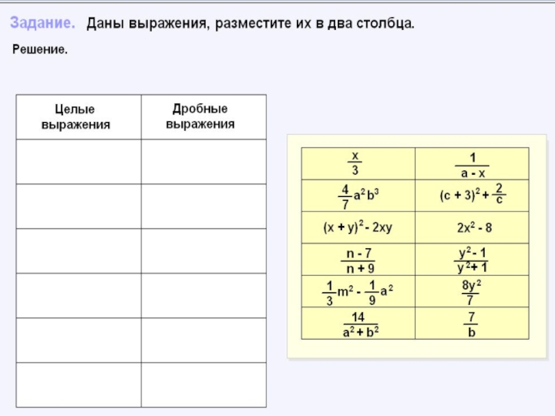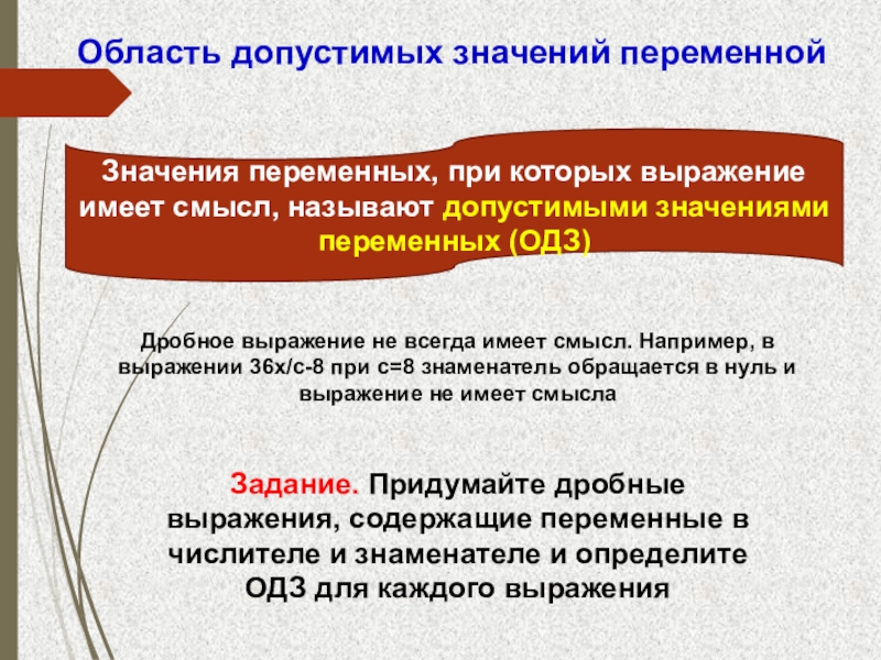 Задание. Придумайте дробные выражения, содержащие переменные в числителе и знаменателе и определите ОДЗ для каждого выражения