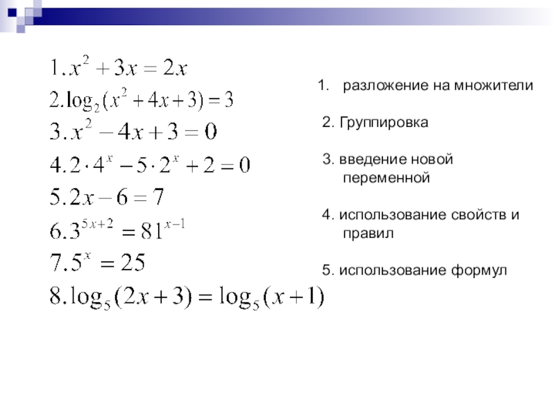 разложение на множители2. Группировка3. введение новой переменной4. использование свойств и правил 5. использование формул