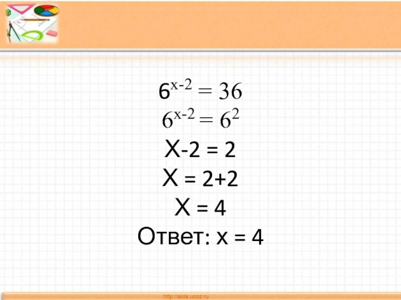 6х-2 = 366х-2 = 62Х-2 = 2Х = 2+2Х = 4Ответ: х = 4