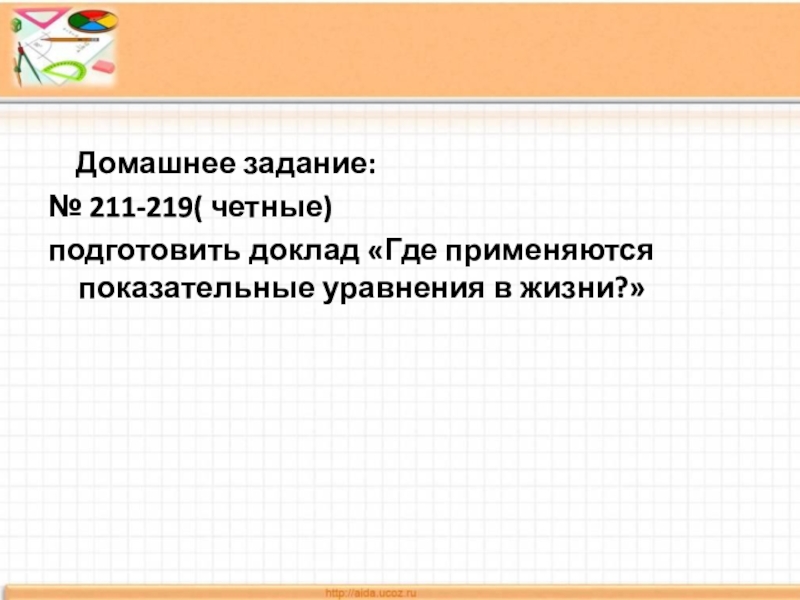 Домашнее задание: № 211-219( четные)подготовить доклад «Где применяются показательные уравнения в жизни?»