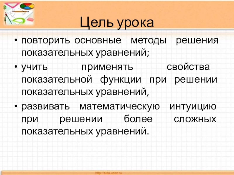 Цель урокаповторить основные методы решения показательных уравнений; учить применять свойства показательной функции при решении показательных уравнений, развивать математическую интуицию при решении более сложных показательных уравнений.