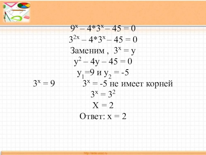 9х – 4*3х – 45 = 032х – 4*3х – 45 = 0Заменим , 3х = уу2