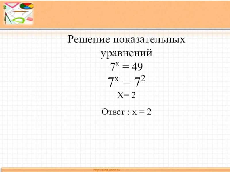 Решение показательных уравнений7х = 497х = 72Х= 2Ответ : х = 2