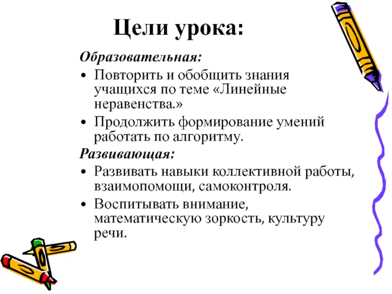 Цели урока:Образовательная:Повторить и обобщить знания учащихся по теме «Линейные неравенства.»Продолжить формирование умений работать по алгоритму.Развивающая:Развивать навыки коллективной