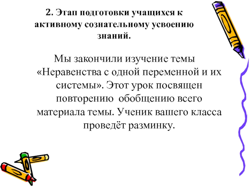 Слайд 6 2. Этап подготовки учащихся к активному сознательному усвоению знаний.
