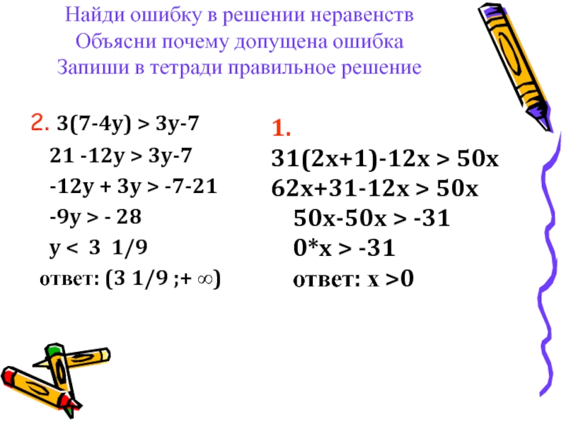 Слайд 20Найди ошибку в решении неравенств Объясни почему допущена ошибка Запиши в тетради правильное