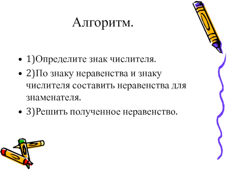 Алгоритм.1)Определите знак числителя.2)По знаку неравенства и знаку числителя составить неравенства для знаменателя.3)Решить полученное неравенство.